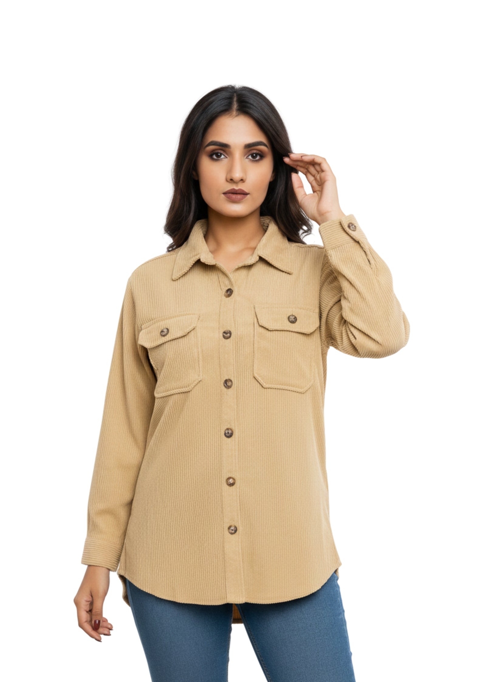 | Design | Textured corduroy finish with vertical ridges (wales); classic spread collar; button-down front with contrasting tortoise-shell buttons; two functional chest pockets with buttoned flaps; buttoned cuffs |