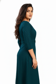 | Style | V-neck A-line midi dress with 3/4 sleeves and pleat details |