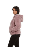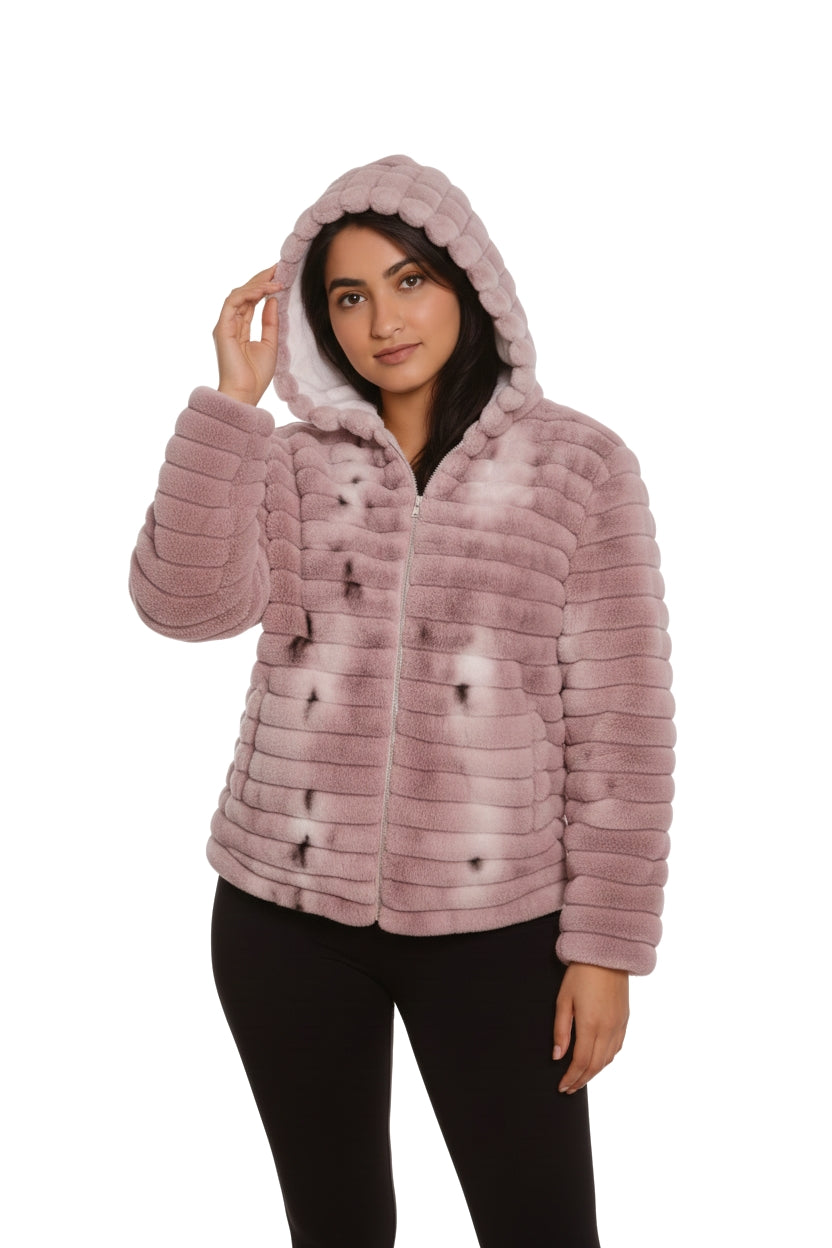 | Design | Soft, horizontal ribbed/banded faux fur texture with distinctive tie-dye pattern; cozy hood with white lining; full zipper closure |