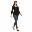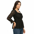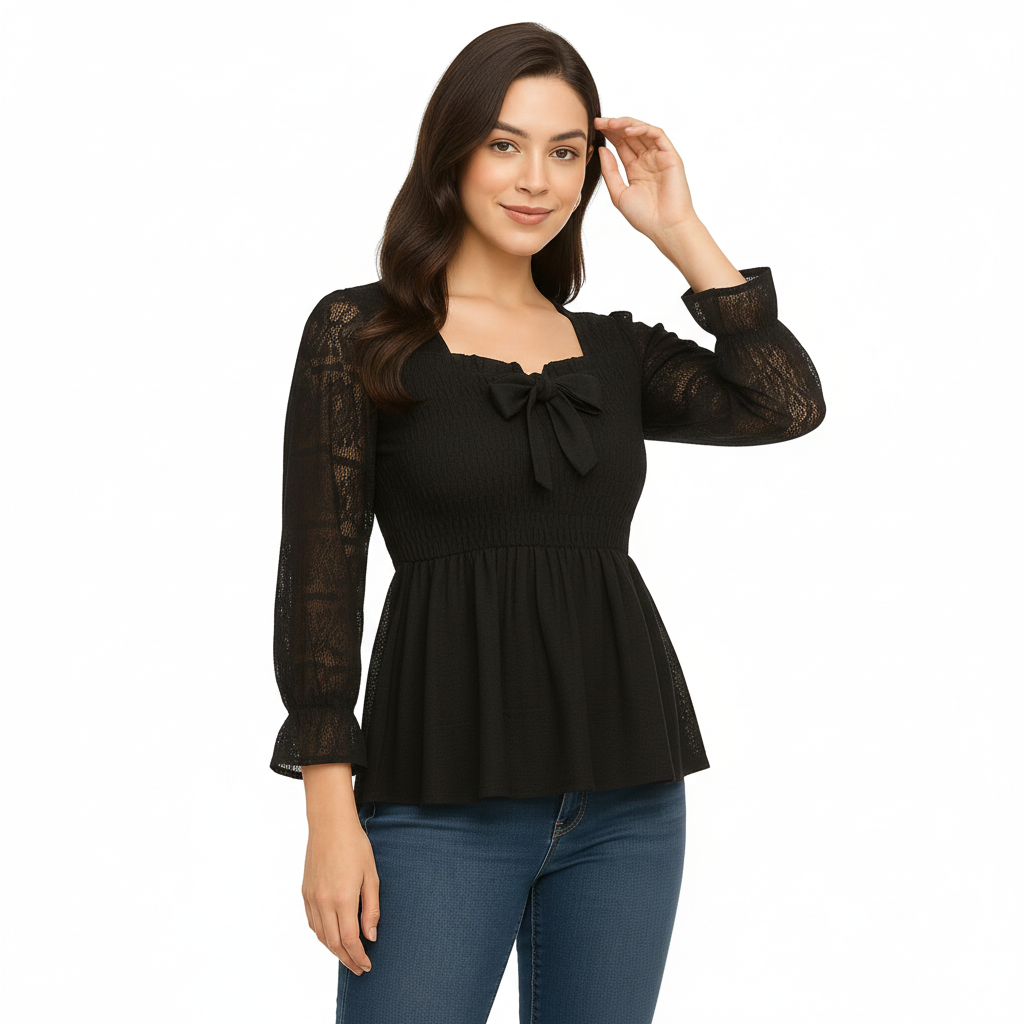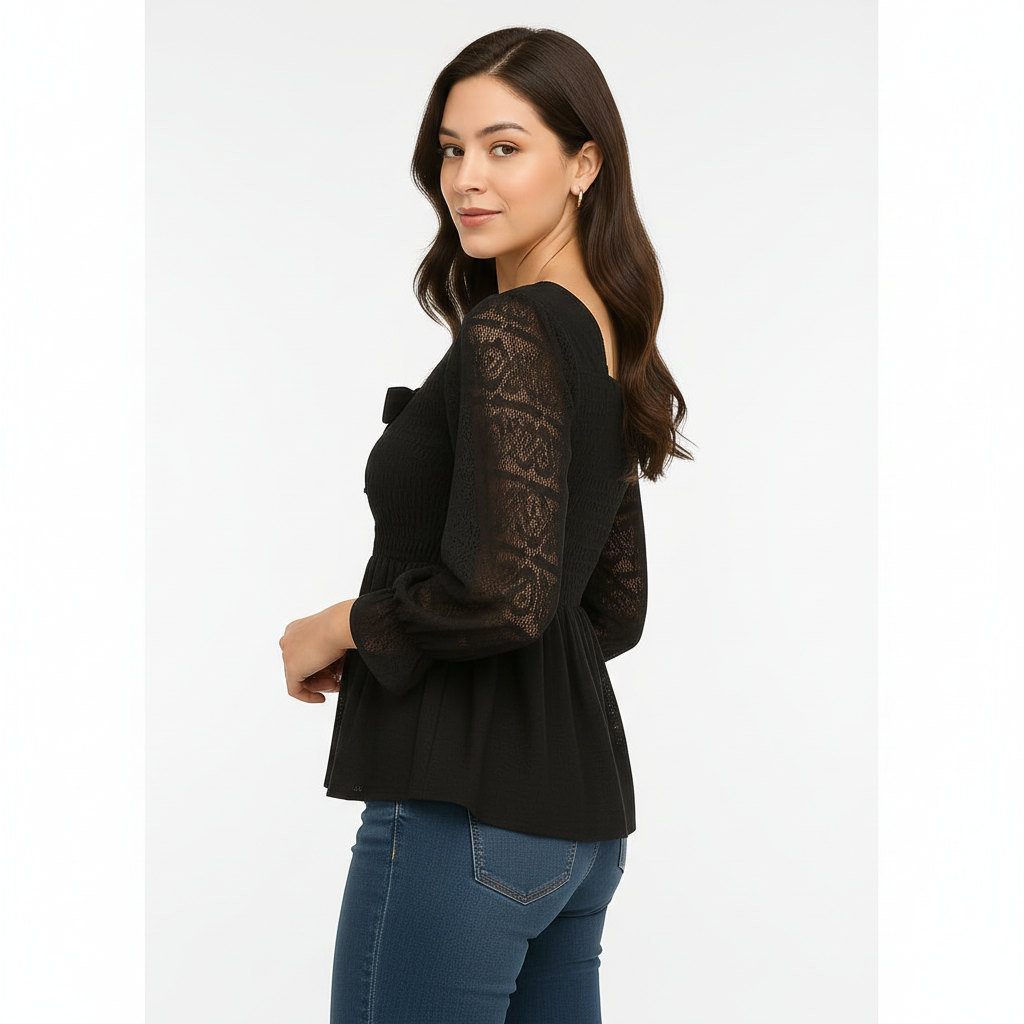| Design | Square, slightly ruffled neckline with central decorative black bow; smocked/ruched bodice for fitted look; long sheer lace/crochet sleeves ending in slight ruffle; peplum hem flaring from waist |