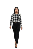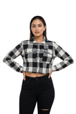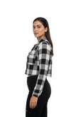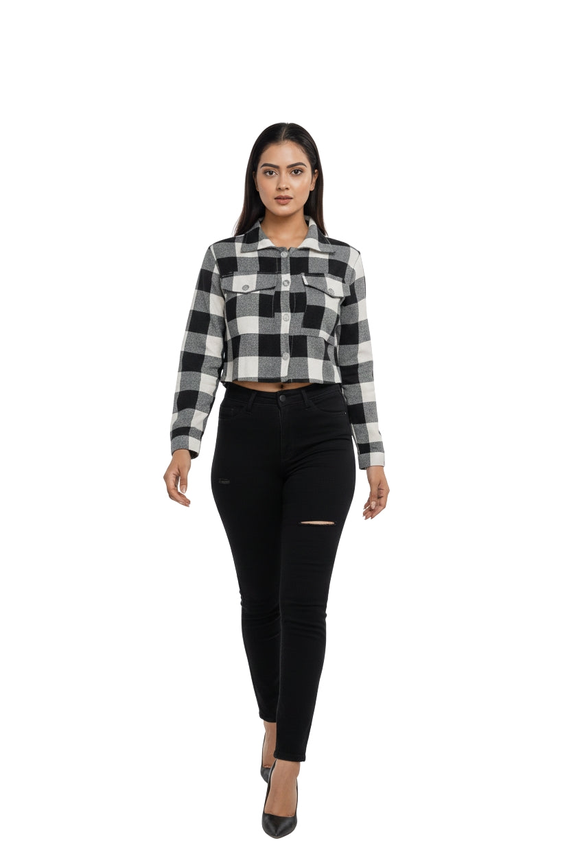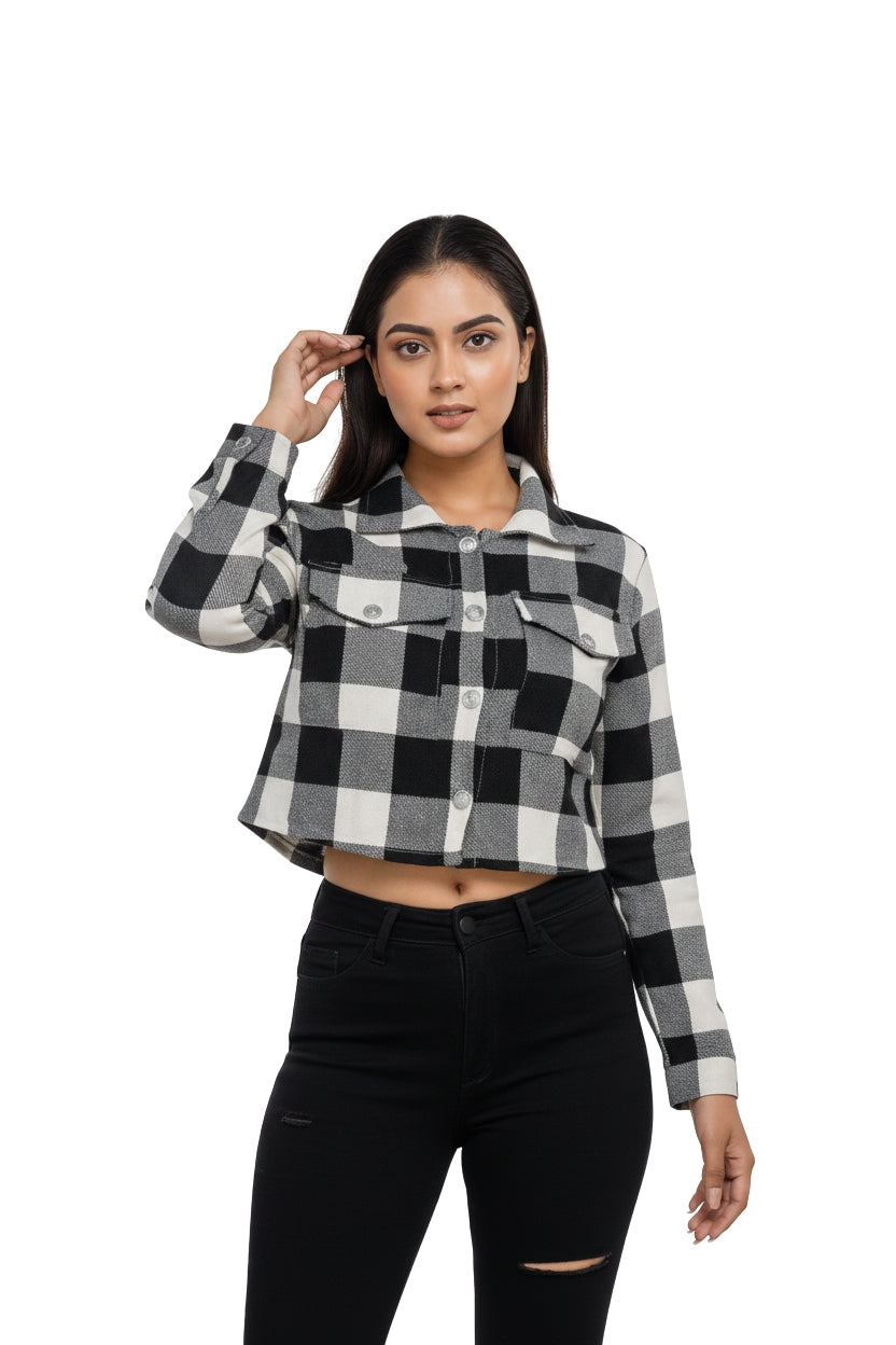 | Design | Trendy cropped silhouette ending above the waist; bold large-check pattern; two chest pockets with button flaps; silver-toned buttons; classic collar |